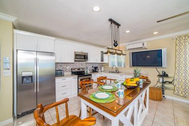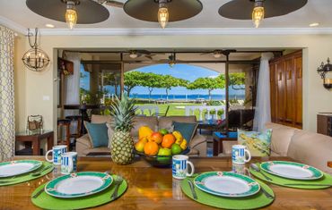 The kitchen is bright and airy. It features stainless steel appliances, granite countertops, and a four-person breakfast island. It has all the utensils and small kitchen appliances you need to enjoy your vacation. The kitchen opens into the main living area, where large sliding glass doors open to the beach and gorgeous views. Enjoy the beach from your covered patio while drinking morning coffee or sipping sunset cocktails!